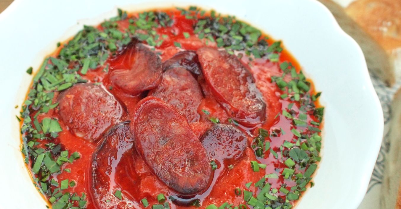 Před podáváním rozmixujeme tyčovým mixérem na jemné pyré a dochutíme trochou vinného octa. Podáváme s opečenou klobáskou chorizo.
