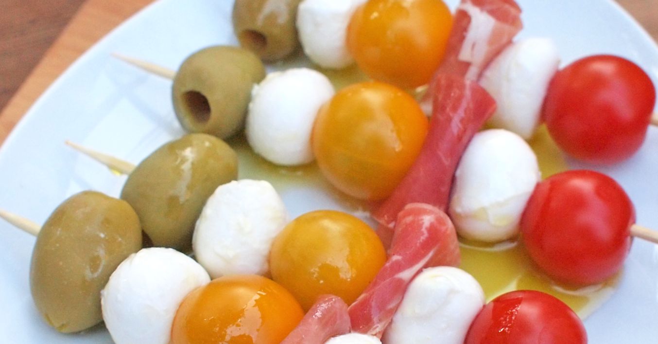 Na zkrácené špejle nebo špízy poté střídavě napíchneme mozzarellu, rajčata, sušenou šunku a olivy. Rozdělíme do misek a zakápneme trochou olivového oleje.