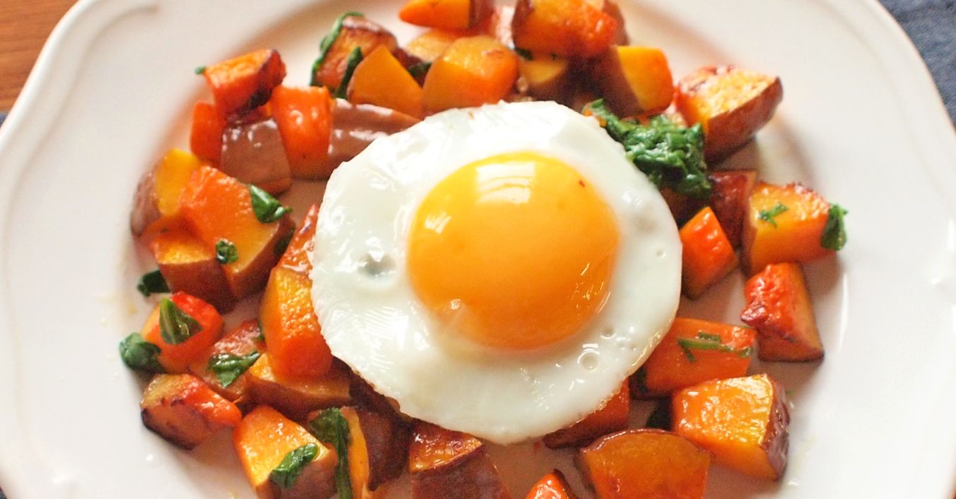 Mezitím si rozehřejeme nepřilnavou pánev a postupně na ní připravíme volská oka. Osolíme, opepříme a podáváme spolu s pečenou dýní.