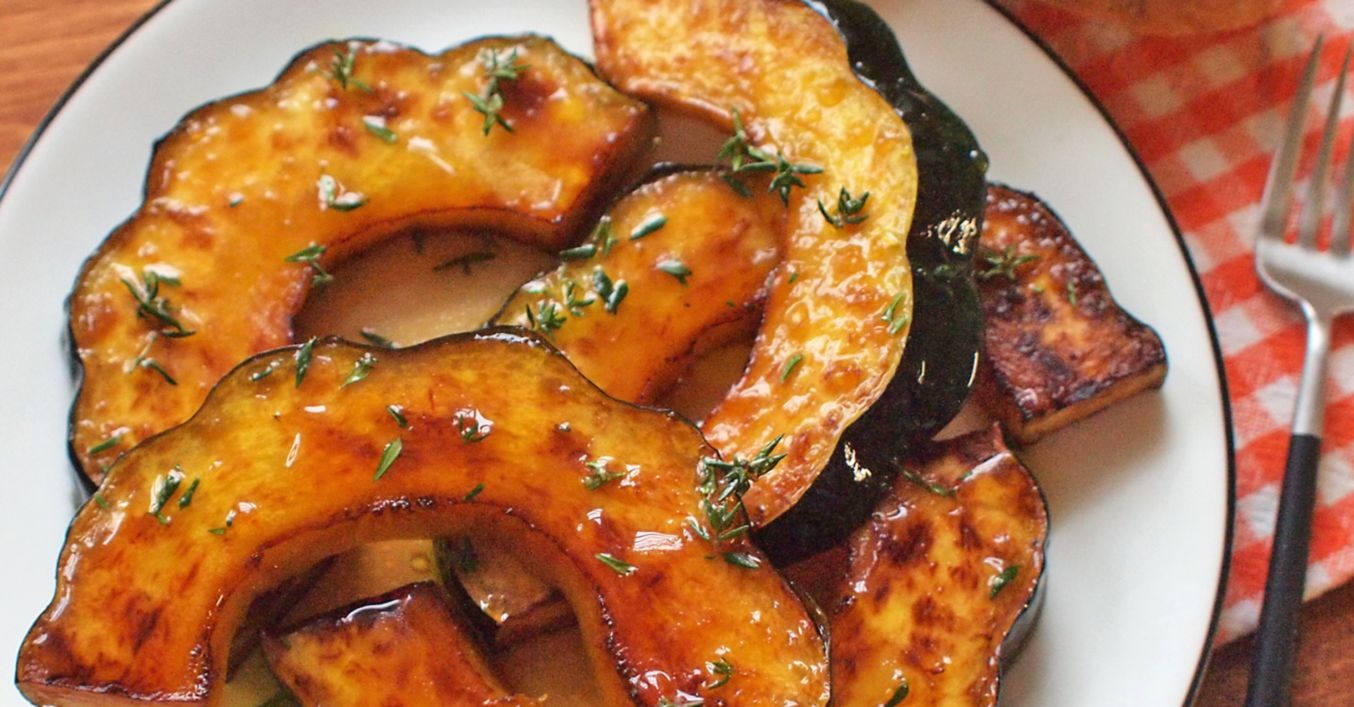 Díly dýně promícháme v misce spolu s olejem a medem. Osolíme a opepříme a promícháme spolu s drhnutým tymiánem.