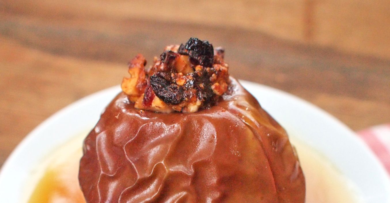 Jablka naplníme ořechy s máslem, dáme do menší zapékací misky a podlijeme jablečnou šťávou. Pečeme asi 45 minut v troubě rozehřáté na 200 °C. Podle potřeby podléváme šťávou navíc, aby se nám nepřipálila.