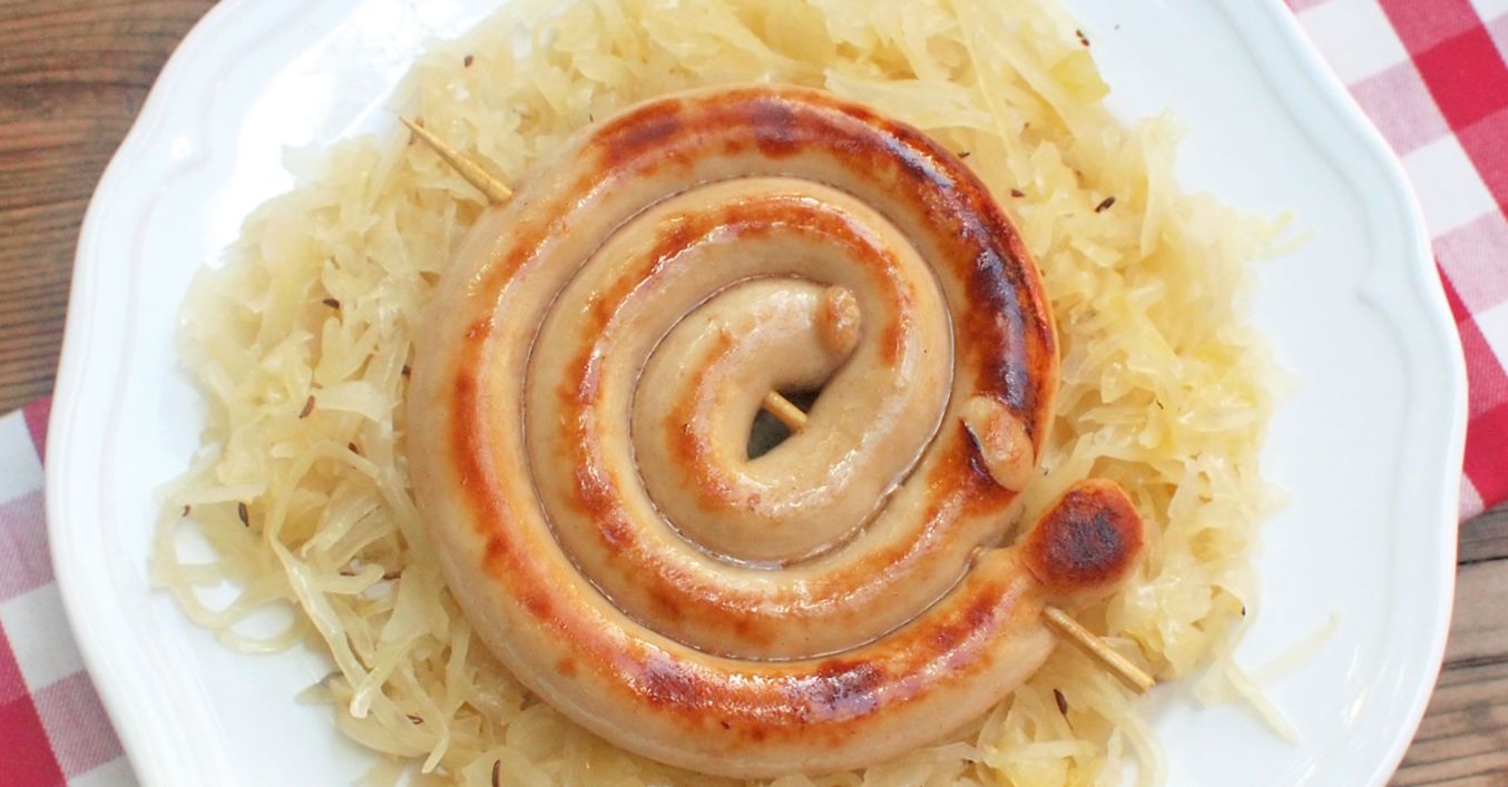 Vinnou klobásu rozmotáme a rozdělíme na stejně dlouhé díly (vyjde nám jich asi 6 až 8). Každý díl pak stočíme do spirály a zajistíme špejlí. Cibuli oloupeme a nakrájíme na plátky. Zelí scedíme a vymačkáme přebytečnou šťávu.