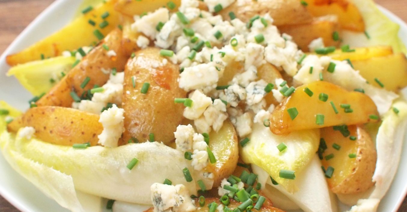Upečené brambory promícháme s čekankou, přidáme rozdrobený plísňový sýr a podáváme.