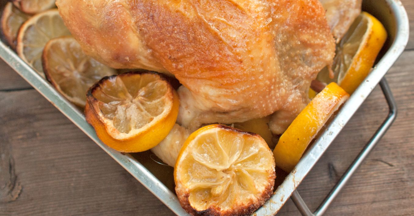 Na dno pekáče rozložíme brambory, posolíme, přidáme lžíci másla a podlijeme trochou vody. Kuře zvenčí i uvnitř pořádně osolíme, opepříme a jeho dutinu vyplníme citronem. Kuře pak dáme doprostřed pekáčku, kolem dokola jej obložíme dílky citronu a vložíme do rozehřáté trouby.