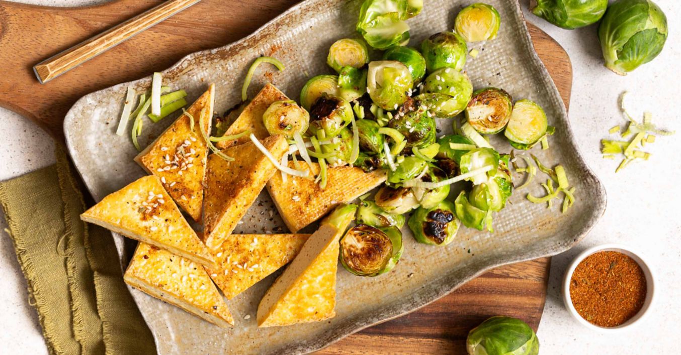 Tofu rozložte na plech s pečicím papírem. K němu přidejte kapustičky.