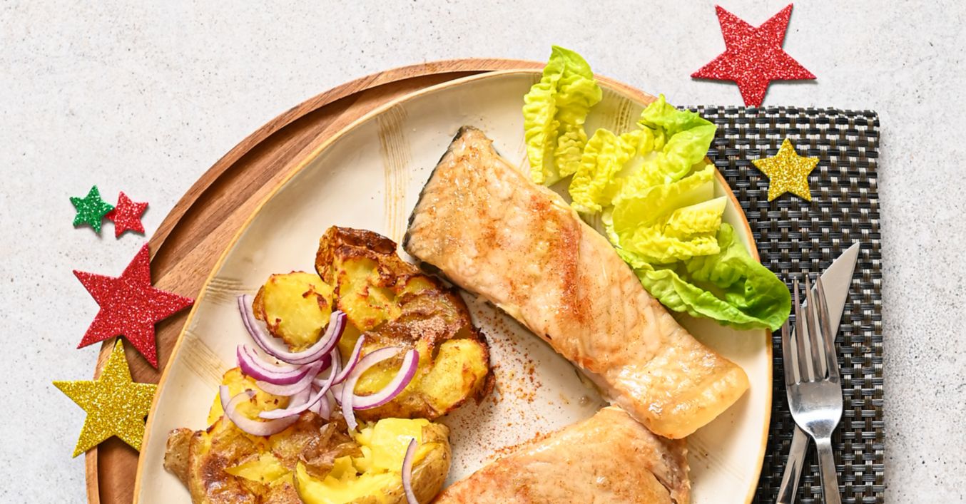 K bramborám přidejte namarinované filety kapra. Pečte 30 minut v troubě vyhřáté na 180 °C.