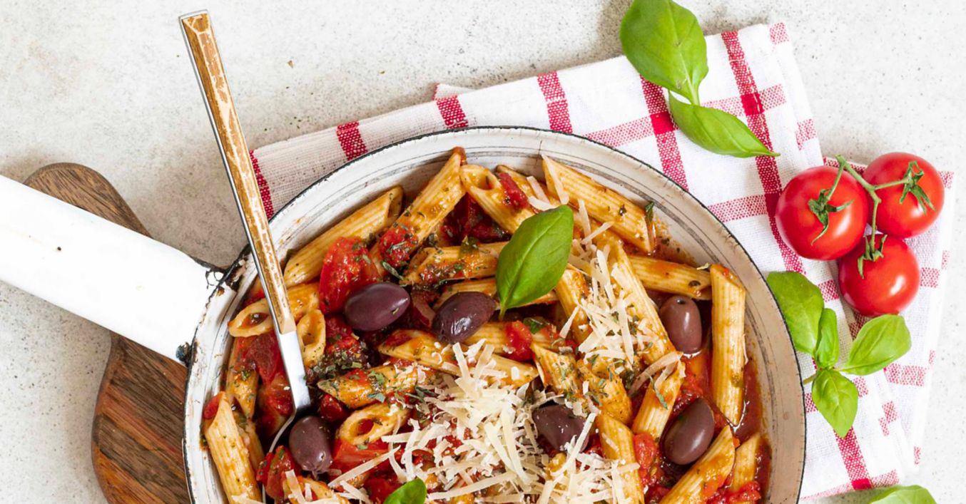 Do omáčky vmíchejte uvařené těstoviny a olivy. Podávejte s nastrouhaným parmazánem a čerstvou bazalkou.