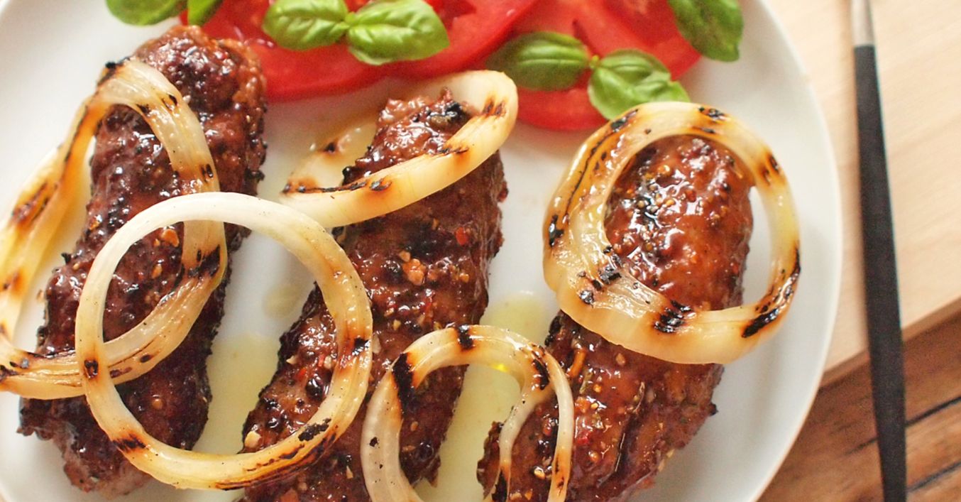 Pepřové čevapčiči s grilovanou cibulí