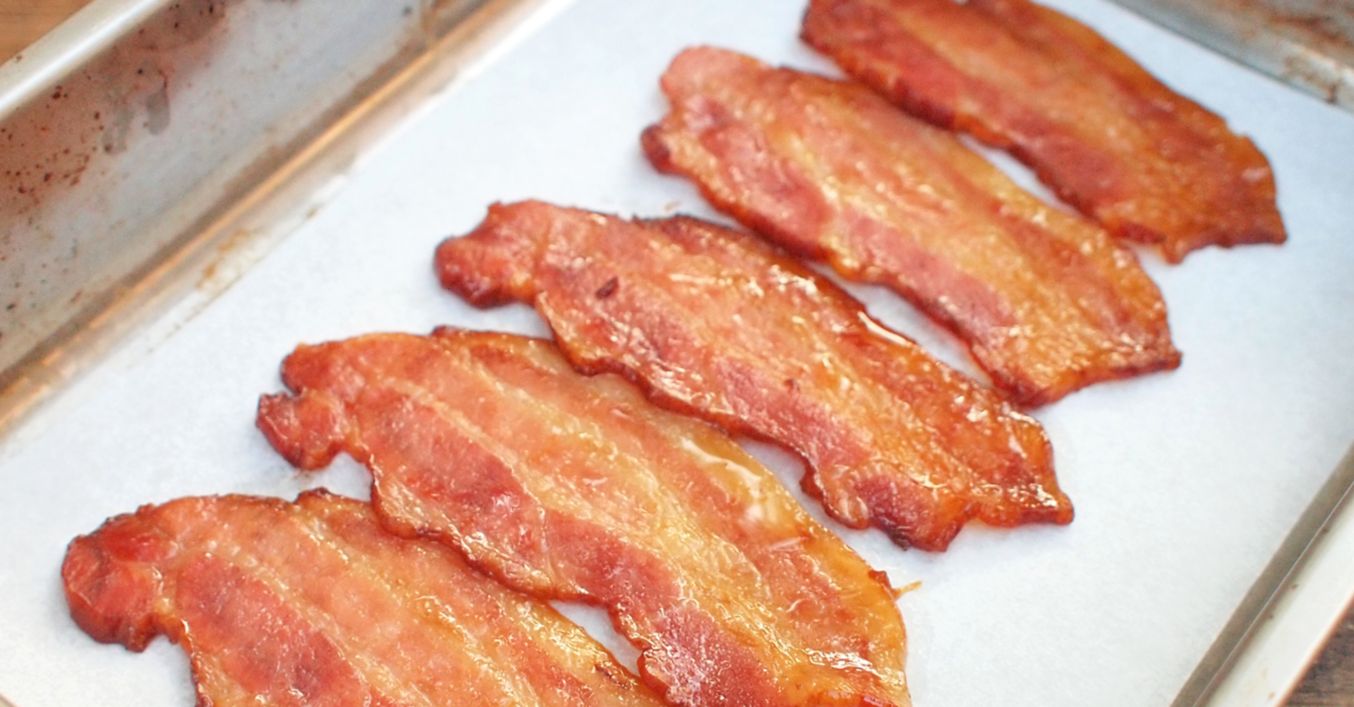 Slaninu potřeme pikantní marinádou a dopékáme dozlatova. Křupavé plátky slaniny ihned podáváme.