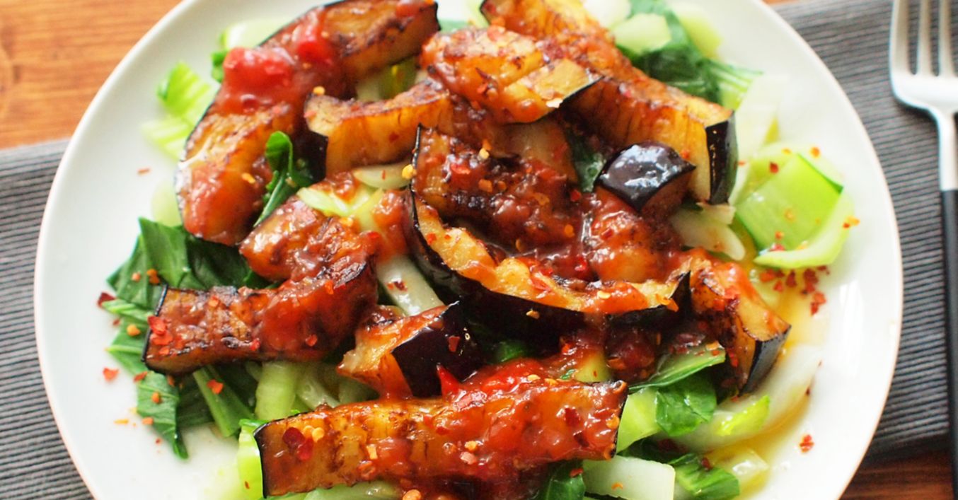 Připravené listy pak choi spaříme ve vroucí osolené vodě (stačí 2 až 3 minuty). Scedíme, nahrubo nasekáme a podáváme s lilkem.