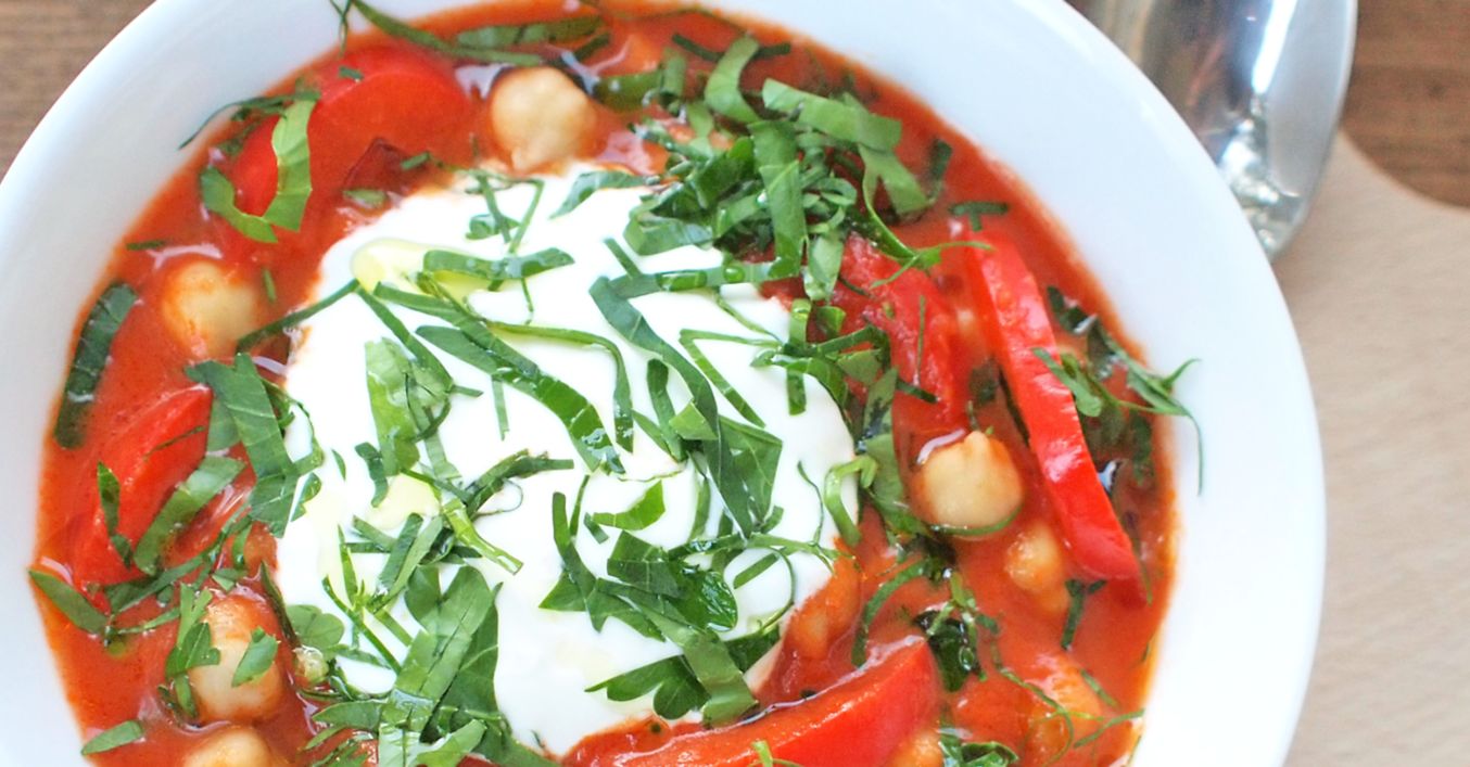 Do hrnce pak přidáme rajčata, scezenou cizrnu a grilované papriky na kostičky. Podlijeme trochou horké vody nebo vývaru. Osolíme, opepříme a dochutíme i římským kmínem a chilli vločkami. Povaříme asi 15 minut.