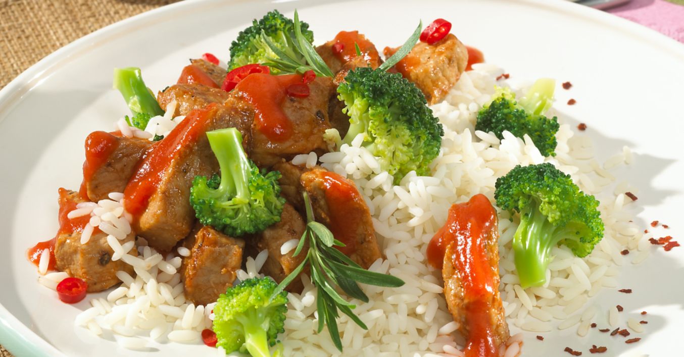 Pikantní rýže s vepřovým masem a brokolicí