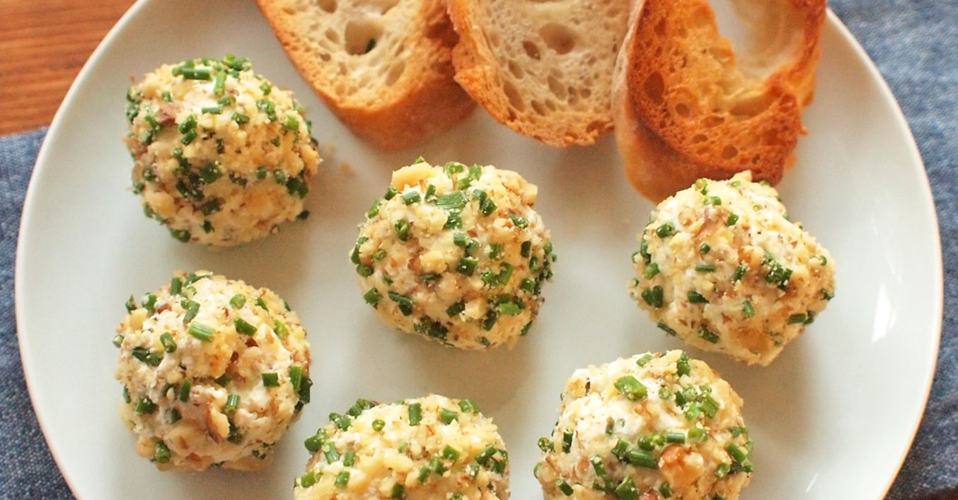 Navlhčenými dlaněmi tvoříme kuličky, které obalujeme ve směsi nasekaných ořech a pažitky.
