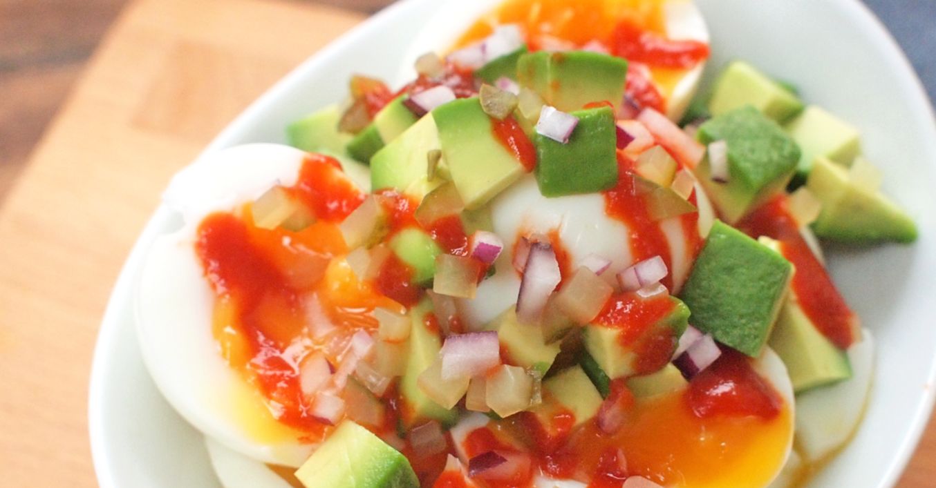 Vejce rozdělíme na porce, přidáme k nim avokádo a dochutíme solí a pepřem. Ozdobíme okurkou a šalotkou. Dochutíme pálivou omáčkou a podáváme.