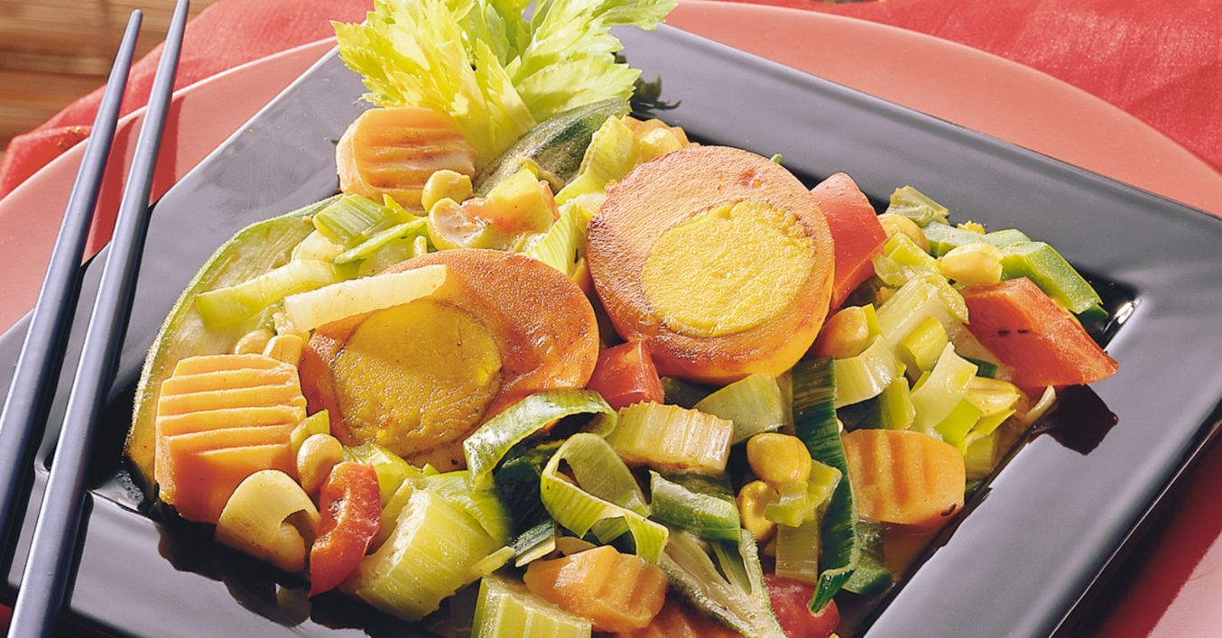 Na zbylém oleji orestujeme cibuli s česnekem. Přidáme zbylou zeleninu, promícháme, zakryjeme a necháme dusit na mírném plameni ve vlastní šťávě asi 10 minut. Zalijeme smetanou, přidáme arašídy a dochutíme solí, pepřem a kari kořením. Podáváme společně s vejci.