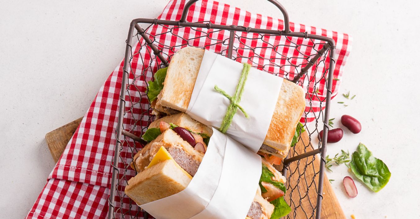 Dva plátky obložime fazolemi, hlávkovým salátem, rajčaty a vejcem. Na každý položíme namazaný toast, na to burgerové placičky a sýr čedar a navrch jeden ze zbývajících toastů. Sendvič trochu zmáčkneme, překrojíme napůl, zabalíme do nepromastitelného papíru a následně si ho vychutnáme na pikniku.