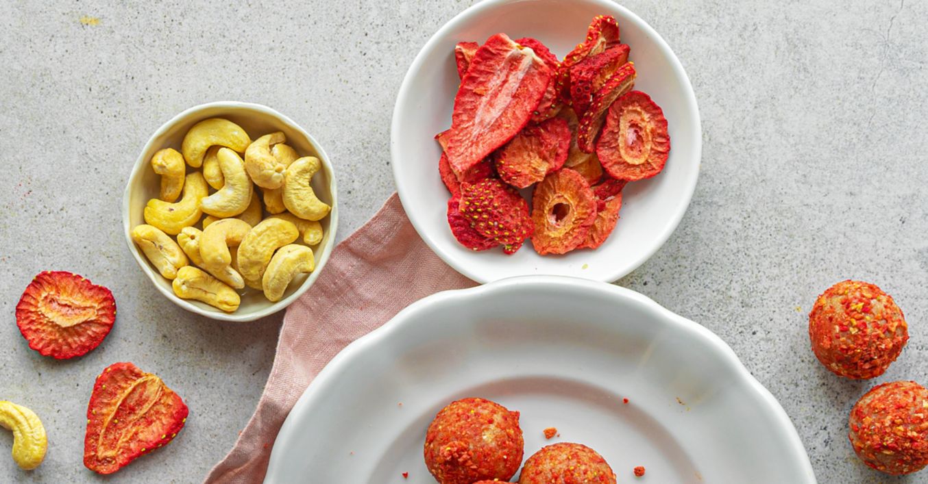 Piškotové kuličky s lyofilizovanými jahodami a kešu ořechy