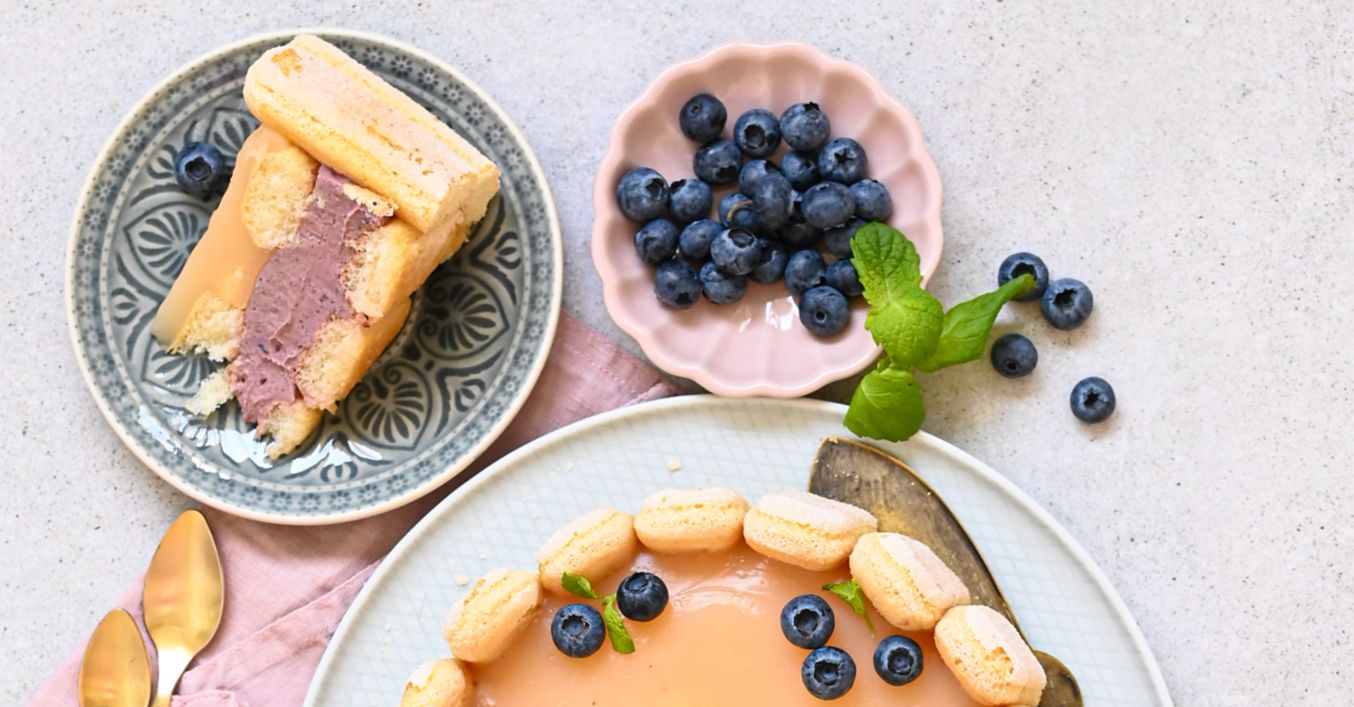 Na dno dejte vrstvu borůvkového krému, na kterou dejte další vrstvu piškotů. Na ně poté dejte vanilkový krém.
