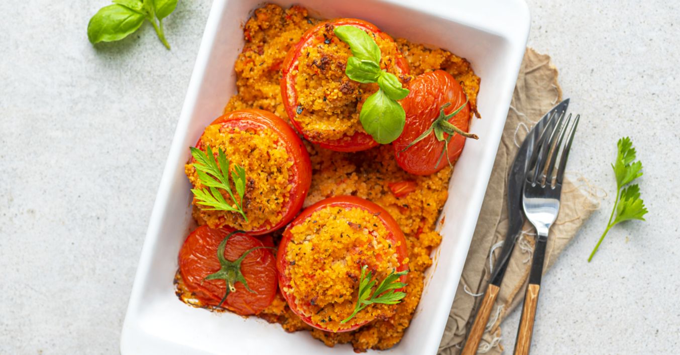 Směsí naplňte rajčata, zbytek nandejte na dno zapékací mísy vymaštěnou olejem. Pečte 20 minut v troubě vyhřáté na 180 °C. Podávejte s čerstvými bylinkami.