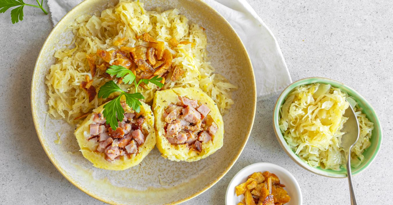 Plněné bramborové knedlíky s uzeným masem a zelím