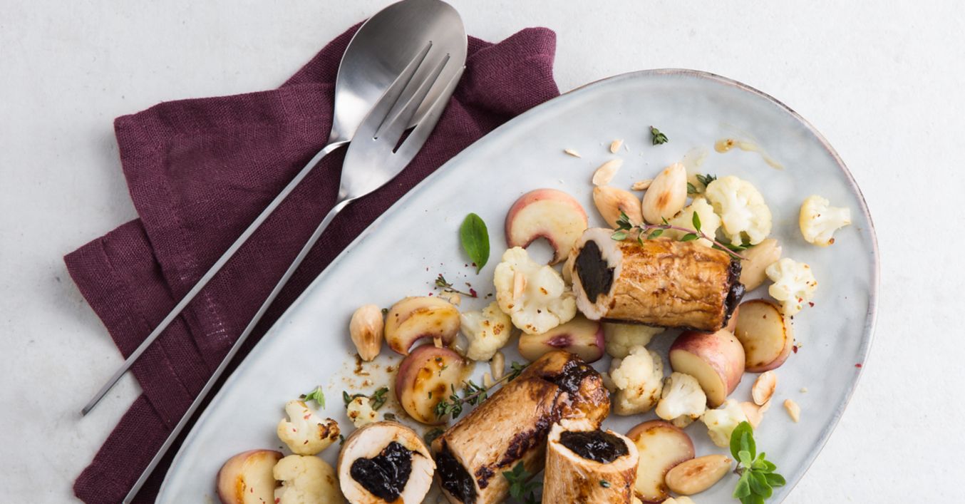 Krůtí plátek rozprostřeme a do spodní části dáme švestky a tymián. Plátek odzdola nahoru stočíme do rolády a zafixujeme vždy alespoň 3 párátky.
