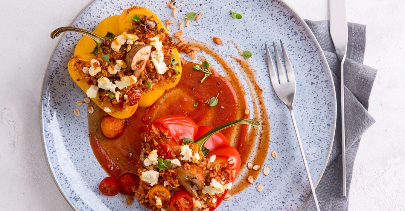 Plněné papriky s celozrnnou rýží a sýrem feta