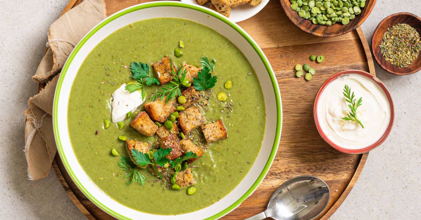 Polévka ze zeleného hrachu se špenátem a chlebovými krutony