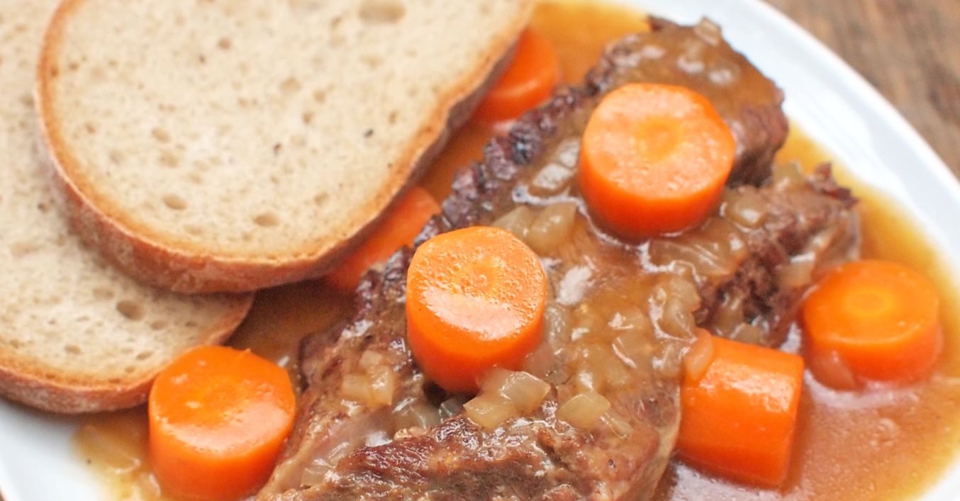 Když je maso měkké, vylovíme koření, odkryjeme a vydusíme na hustší šťávu. Ihned podáváme.