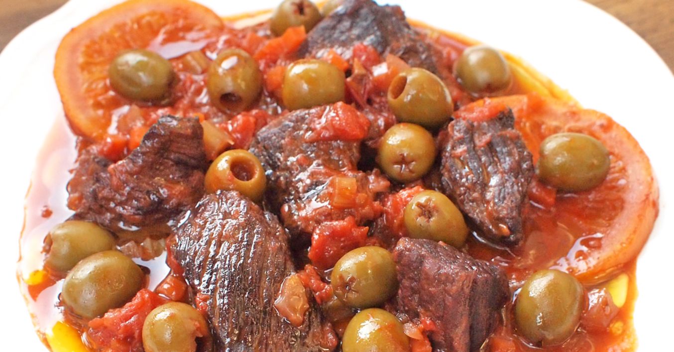 K zelenině vrátíme maso a přidáme koření, olivy, pomeranč, drcená rajčata, víno a vývar. Přivedeme k mírnému varu bez velkých bublin a dusíme 2 až 3 hodiny do změknutí.