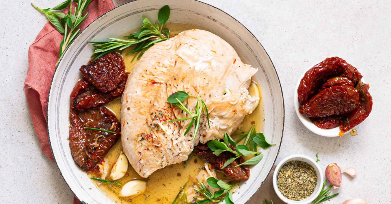 Pomalu pečené krůtí prso na rozmarýnu se sušenými rajčaty