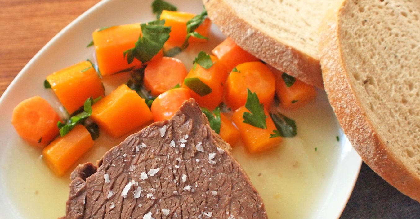 Z vývaru vylovíme uvařenou mrkev a dáme ji stranou na pánev. Přidáme trochu vývaru a máslo. Promícháme a dochutíme solí a pepřem. Odstavíme a vmícháme čerstvé bylinky. Společně podáváme s hovězím masem nakrájeným na plátky.