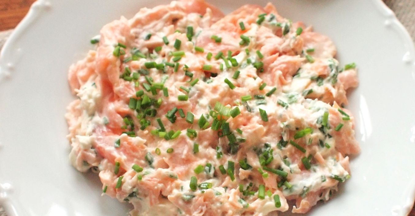 Upečeného lososa oddělíme od kůže a necháme vychladnout. Rybí maso poté rozdrobíme do mísy. Přidáme smetanu, pažitku, nasekané okurky a najemno nasekanou šalotku. Promícháme a podle chuti ještě mírně osolíme, opepříme a zastříkneme trochou citronové šťávy.