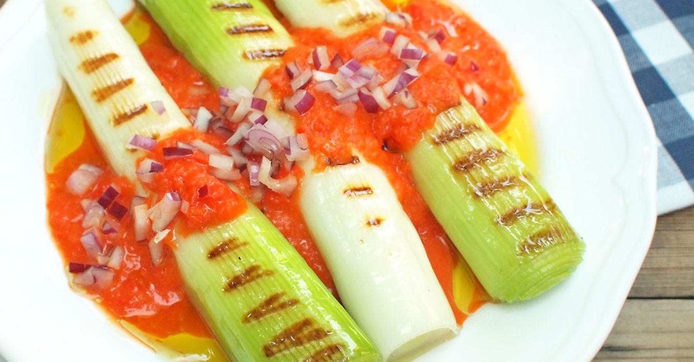 Uvařený pórek scedíme, osušíme a potřeme trochou oleje. Grilujeme pak už asi jen 10 minut z obou stran a podáváme spolu s paprikovým pyré.