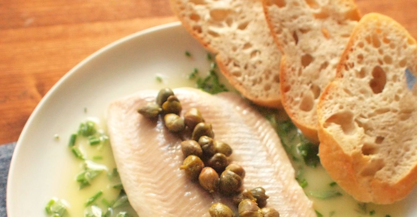 Do připravené várky opatrně vložíme filety kůží dolů a povaříme asi 8 minut. Hotové filety vyjmeme a dáme stranou kůží nahoru. Kůži opatrně sloupneme. Přidáme bylinkové máslo, kapary a podáváme.