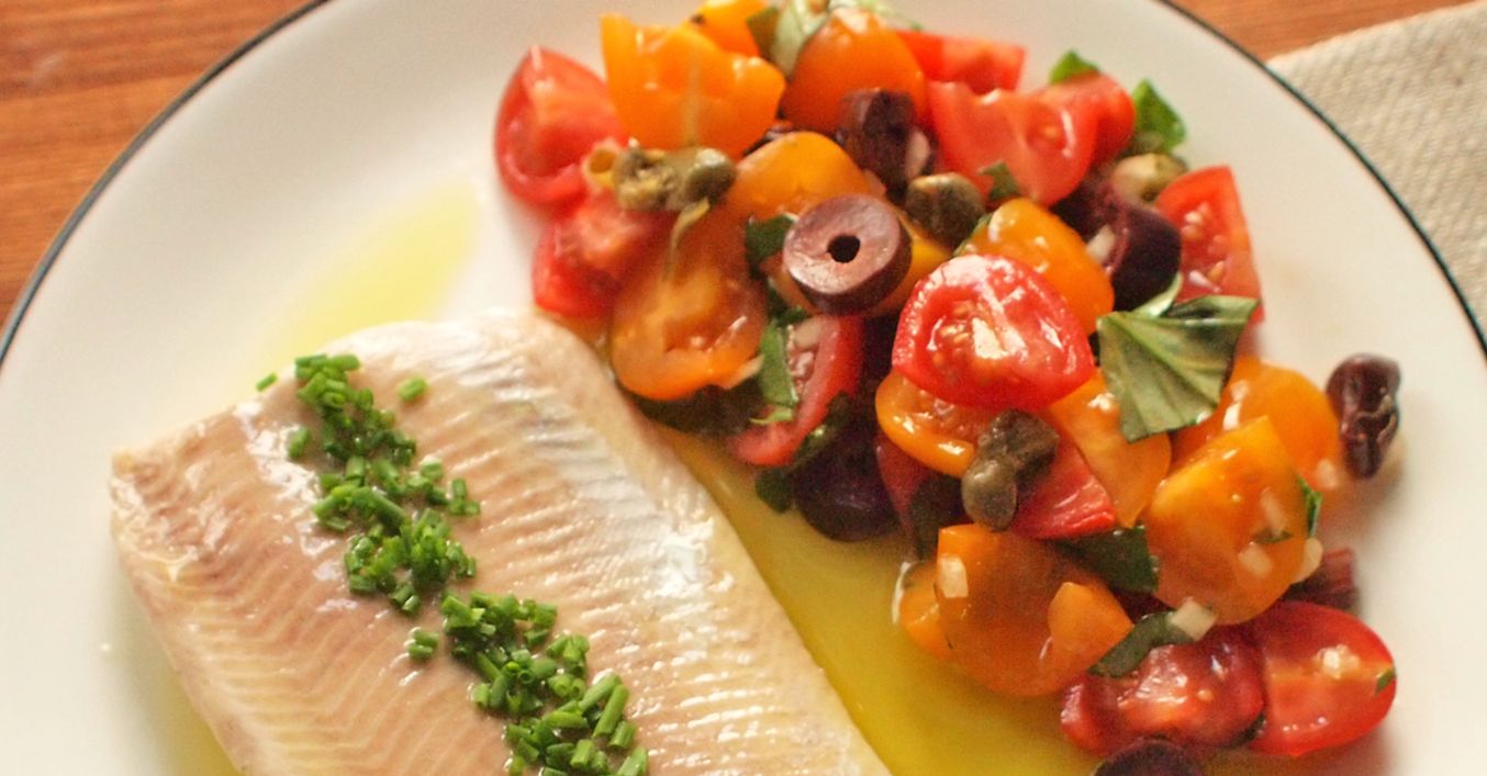 Filety mírně osolíme a necháme odležet. Rajčata očistíme a rozpůlíme. Šalotku oloupeme a nasekáme nadrobno. Olivy nakrájíme na plátky. Bazalku očistíme a nahrubo nakrájíme.