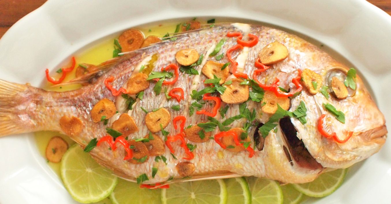 Hotové ryby dáme na servírovací talíř. Zasypeme křupavým česnekem a chilli papričkou. Zakápneme olivovým olejem, limetkovou šťávou a podáváme.