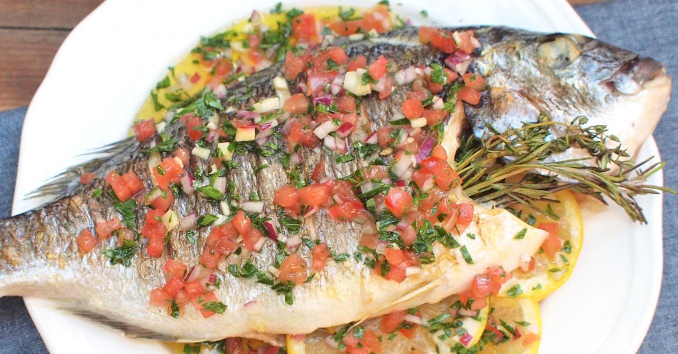 Ugrilované ryby naservírujeme na velkém talíři a zalijeme připravenou salsou.