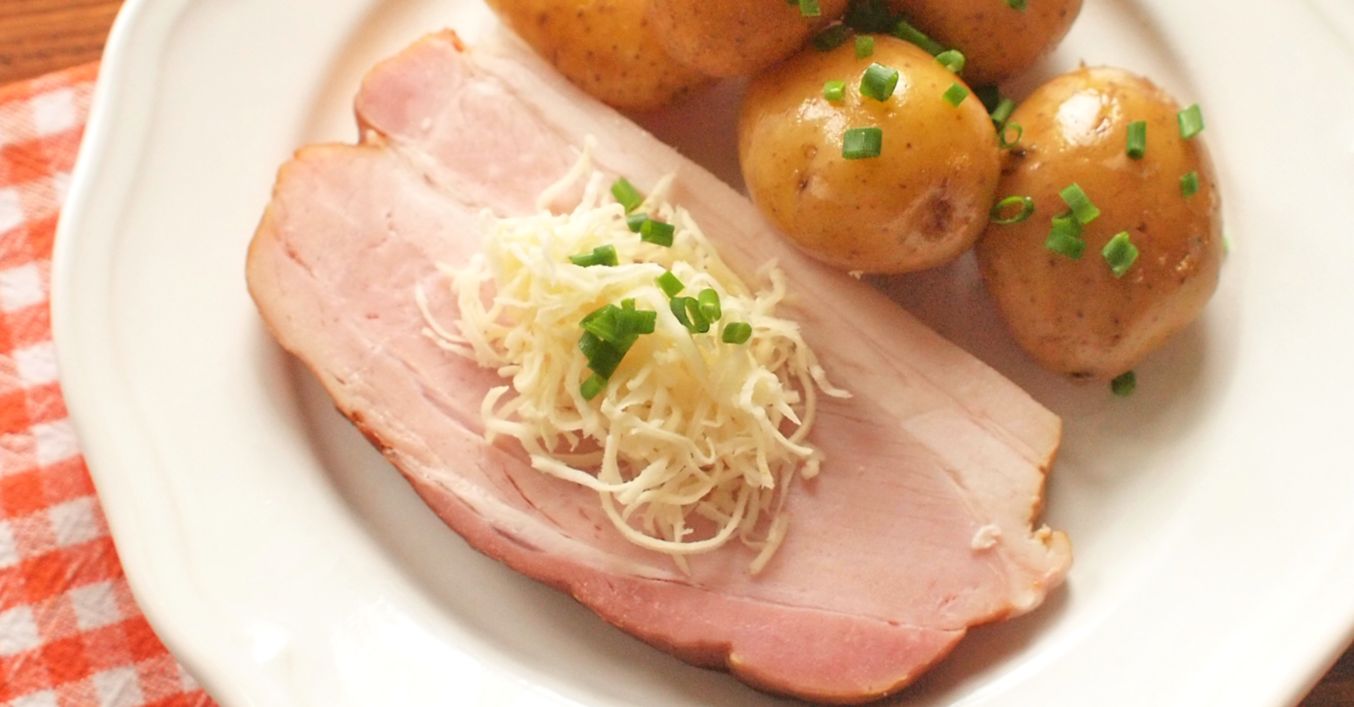Křen oloupeme a nastrouháme. Uvařenou šunku nakrájíme na silnější plátky a podáváme s bramborami a křenem.