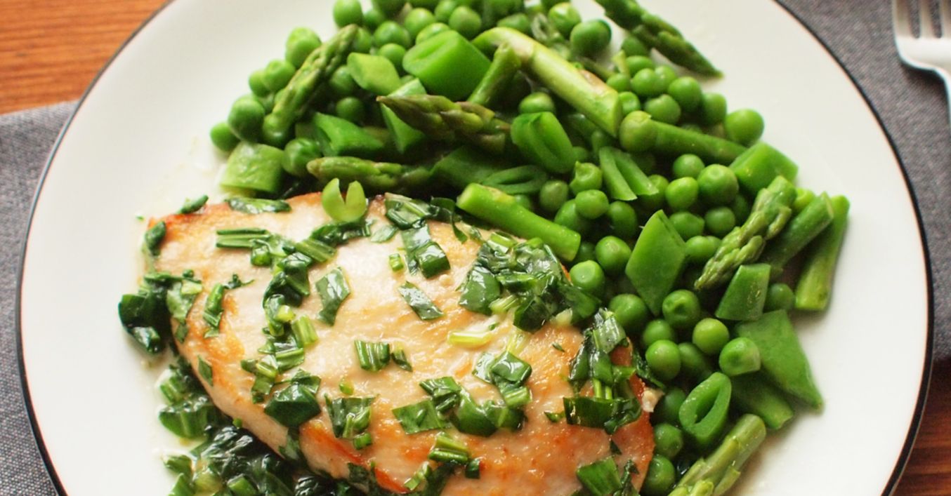 Když je kuře hotové, přidáme k němu oba druhy hrášku, chřest, máslo a chvíli podusíme. Na konci zasypeme bylinkami, osolíme, necháme zavadnout a podáváme.