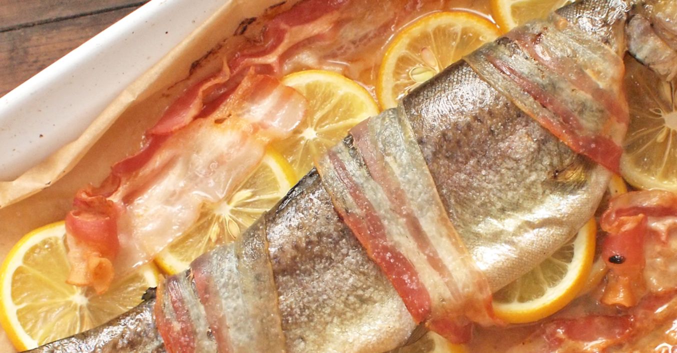 Pekáček vysteleme pečícím papírem. Na dno dáme zbylé plátky citronu, slaninu a na ně položíme ryby. Dáme do trouby vyhřáté na 200 °C a pečeme 30 minut, dokud není maso měkké a slanina hezky křupavá.