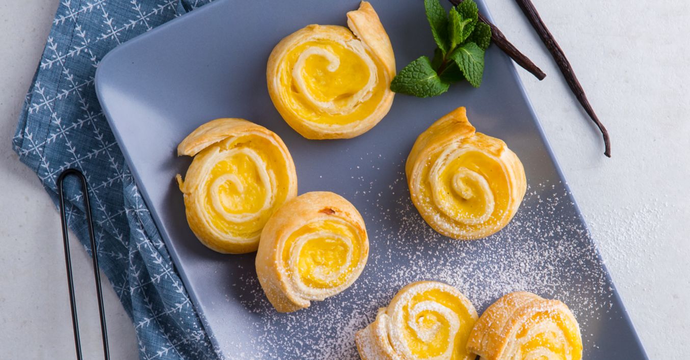 Vyválejte listové těsto a rovnoměrně na něj rozetřete pudinkovou směs. Listové těsto podélně srolujte, nakrájejte na 12 dílů a položte na plech vyložený pečicím papírem.