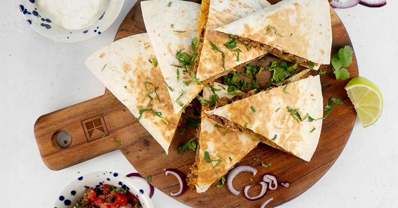 Quesadillu nakrájejte na trojúhelníčky a podávejte se salsou a zakysanou smetanou.