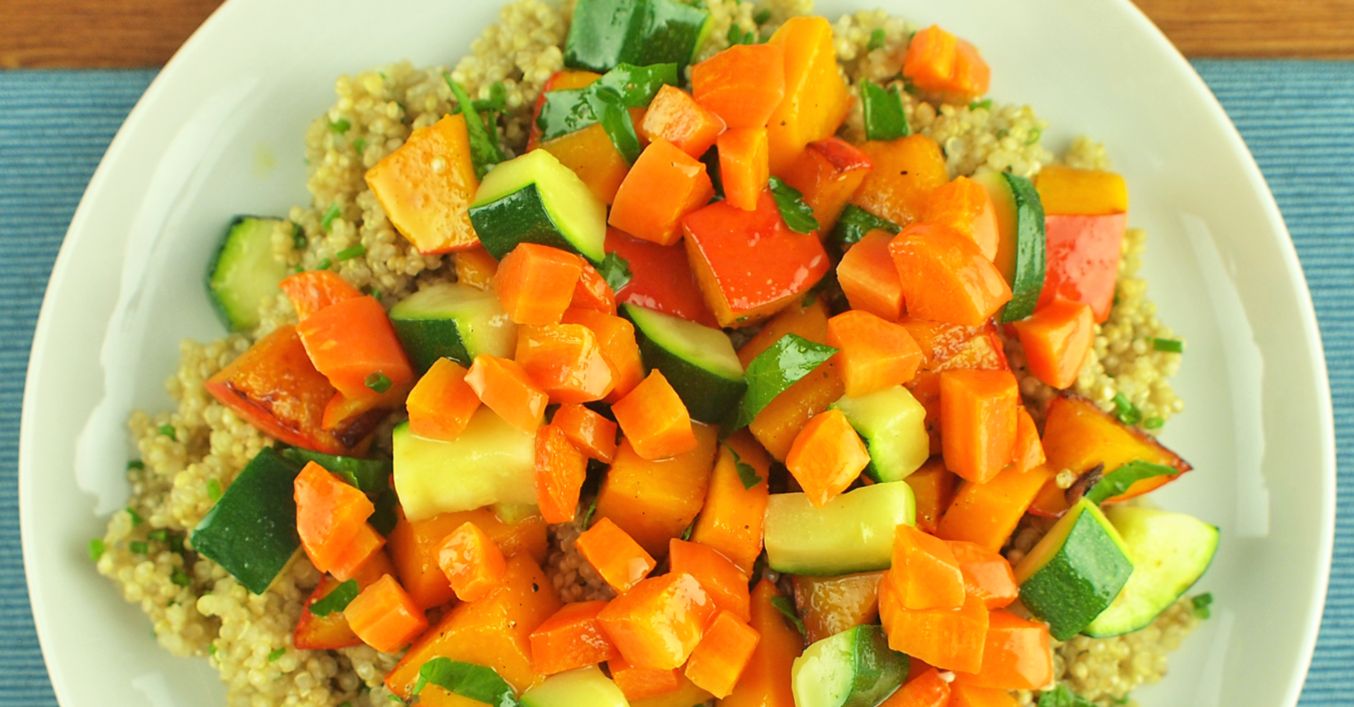 Quinou promícháme bylinkami a polovinou olivového oleje. Dochutíme solí a pepřem. Přidáme pečenou zeleninu, bylinky a zastříkneme zbylým olivovým olejem.