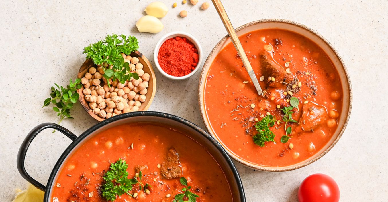 Z polévky vyjměte maso. Zeleninu s vývarem rozmixujte tyčovým mixérem najemno. Přidejte uvařenou cizrnu, podle chuti osolte a opepřete. Kousky masa vraťte zpět do polévky.