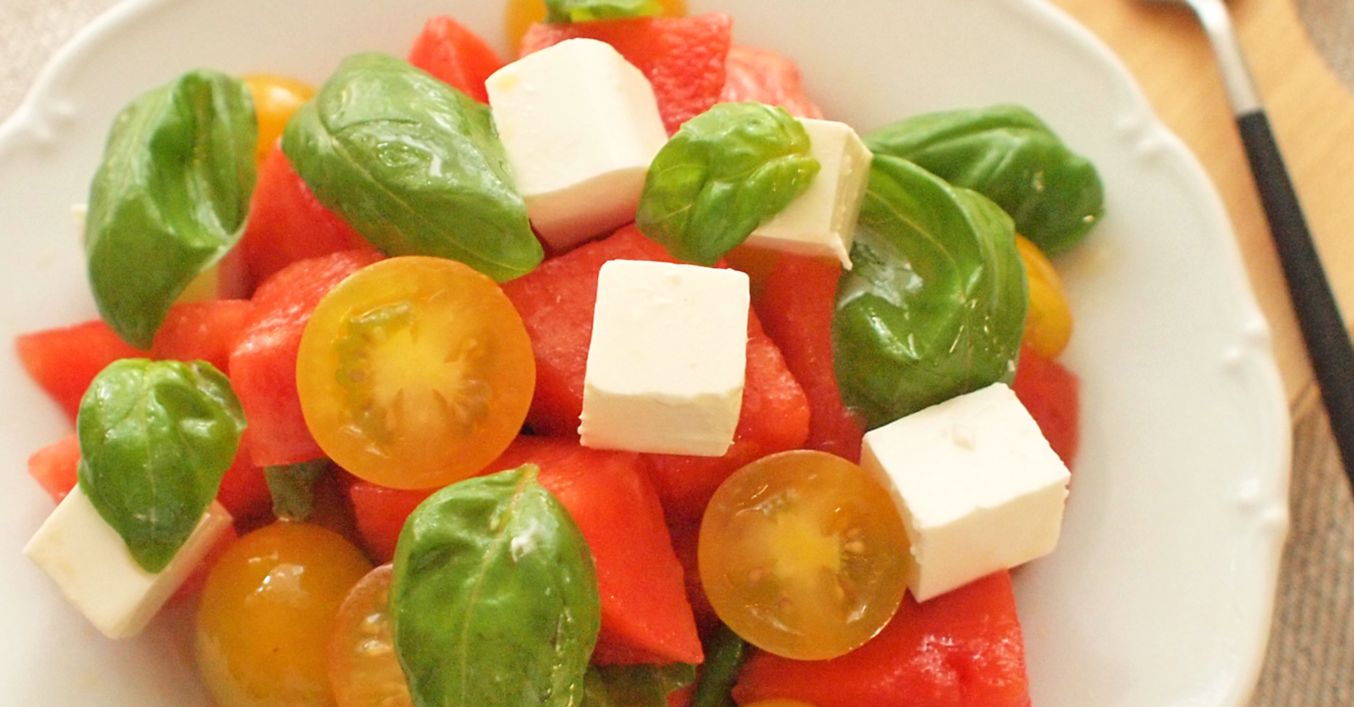 Rajčata očistíme a rozpůlíme. Meloun nakrájíme na kostky. Bazalku očistíme a obereme na lístky. V misce rozmícháme olivový olej s trochou medu. Přidáme citronovou šťávu a rozšleháme. Zálivku dochutíme solí a pepřem.