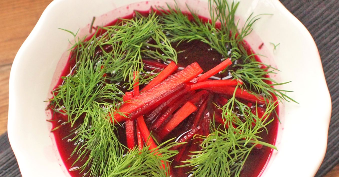 Do misek nejprve rozdělíme zakysané zelí, poté přidáme odleželou zeleninu a zalijeme šťávou z řepy. Zdobíme koprem a podáváme.