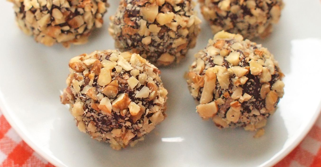 Zbylé ořechy nasekáme nožem nahrubo. Z rozmixované směsi navlhčenou rukou vytvarujeme kulaté pralinky, které obalíme v sekaných oříšcích.