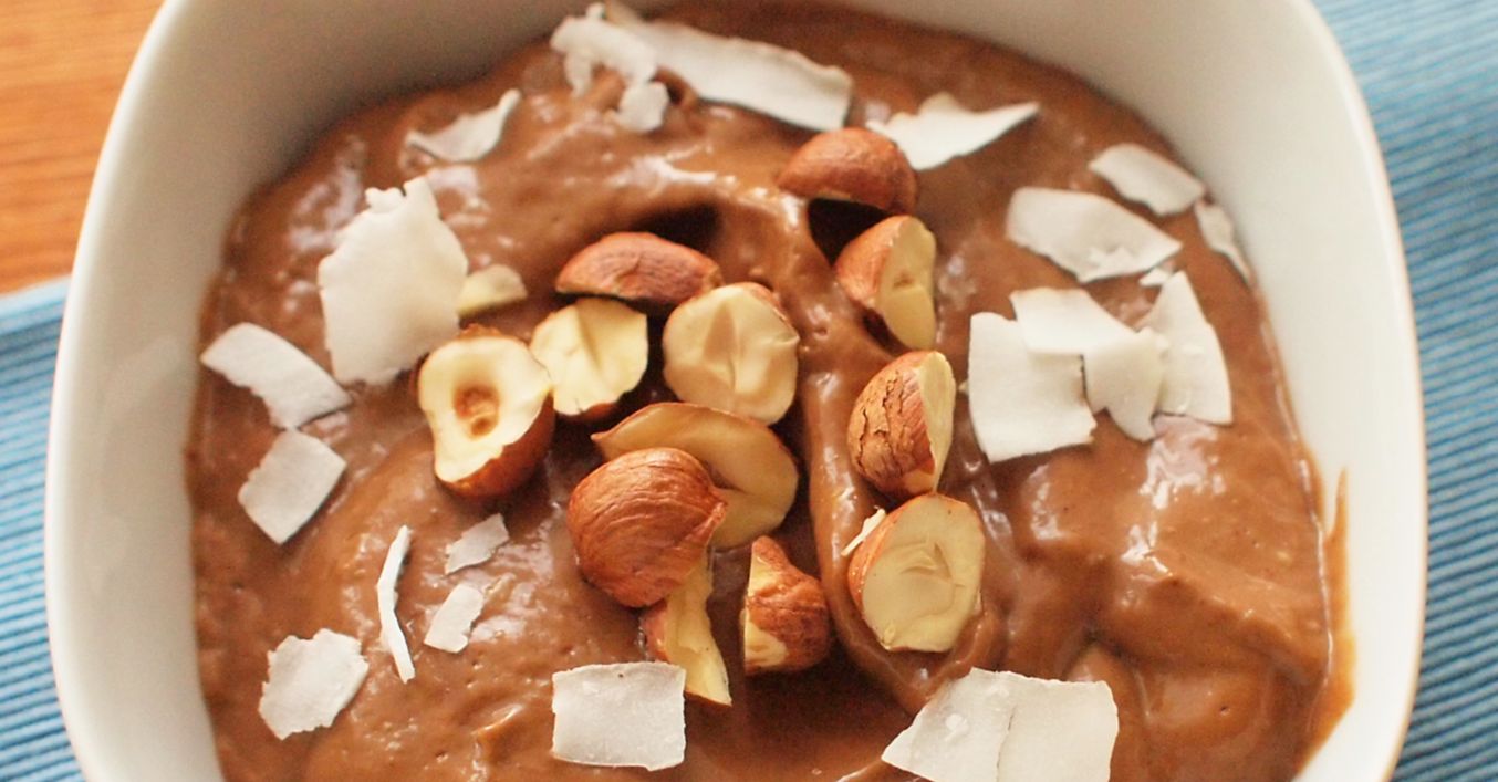 Avokádo oloupeme a zbavíme pecky. Banány oloupeme a nakrájíme.Do mixéru dáme avokádo, banány, ořechové máslo, kakau a vanilkový extrakt se špetkou soli. Vše pak rozmixujeme na hladký krém.Kokosovou smetanu vyšleháme podle návodu na obalu. Pudink rozdělíme do pohárů a ozdobíme našlehanou smetanou.