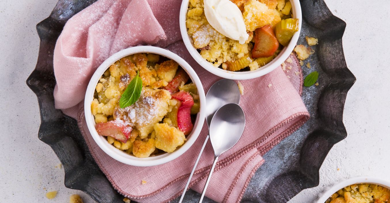 Kousky rebarbory rozdělíme do 4 malých zapékacích misek, zasypeme hnědým cukrem a drobenkou. Pečeme v troubě 15 až 20 minut.