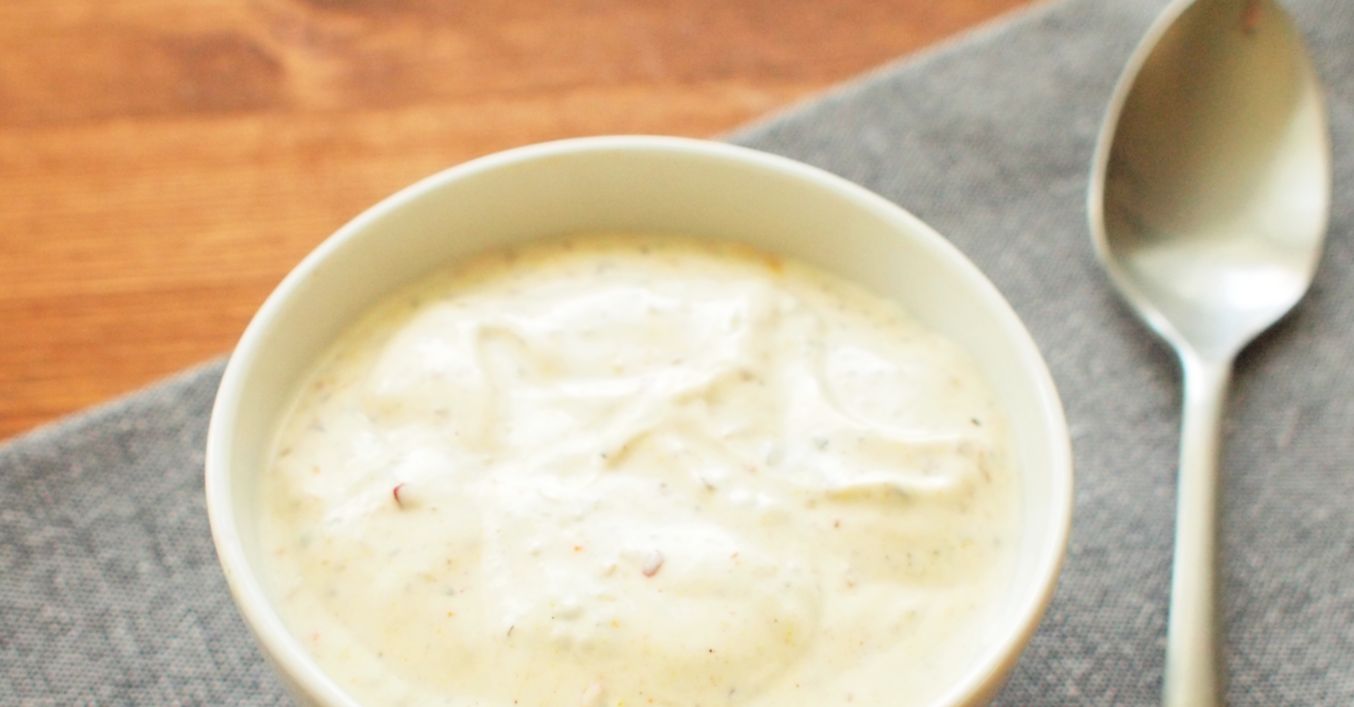 Česnek oloupeme a nasekáme nadrobno. V misce smícháme jogurt, česnek, olivový olej, oregano a šťávu z citronu. Osolíme a opepříme. Zakryjeme a uchováme v chladu.